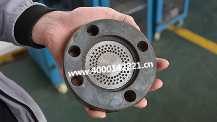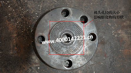 機器膨化完成后,需要把螺桿、螺套、機頭卸下,機頭用煤氣爐或者天然氣爐燒,不要用電磁爐,把里面的殘留廢物清理干凈。目前還沒有比較好的辦法清理機頭,加熱15分鐘左右,即可把機頭拿下來;加熱好后的機頭,需要將貼片先取出,使用一根羊毛刷固定機頭,用螺絲刀可以把貼片取下。然后使用隨機的鋼絲把小孔清通,以備下次使用;