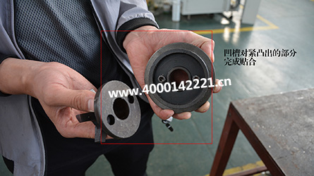 9.安裝機頭的操作過程;把加熱好的機頭,小心,燒好的機頭拿的時候需要特別注意安全。螺紋短的那頭擰進去,把機頭的四個孔對緊機頭的四個孔,平行貼合上去。