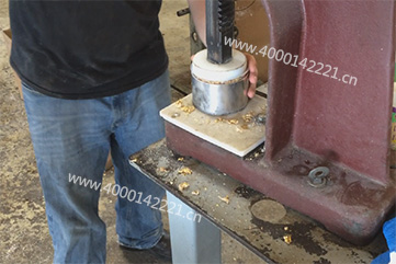 在視頻例四 中,稱重后的原料盒放在一個(gè)液壓機(jī)下方,將一截塑料管放入盒中,然后和產(chǎn)品一起被壓平。消費(fèi)者買到產(chǎn)品后,可以用一個(gè)帶有針的固定器穿過圓孔,將產(chǎn)品掛起。這四個(gè)視頻說的是0.45kg的產(chǎn)品,另外一個(gè)1.6kg的產(chǎn)品,形狀和做法是類似的,只是尺寸更大。